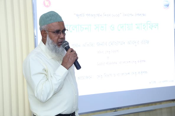 'জুলাই গণঅভ্যুত্থান দিবস ২০২৫' উদযাপন উপলক্ষে সেতু বিভাগ ও বাংলাদেশ সেতু কর্তৃপক্ষের আয়োজনে সেতু ভবন মসজিদে আলোচনা সভা অনুষ্ঠিত হয়। আলোচনা সভায় প্রধান অতিথি হিসেবে উপস্থিত ছিলেন জনাব মোহাম্মদ আবদুর রউফ, সচিব, সেতু বিভাগ ও নির্বাহী পরিচালক, বাংলাদেশ সেতু কর্তৃপক্ষ। আলোচনা সভায় সচিব মহোদয় সকল প্রকার বৈষম্যমুক্ত বাংলাদেশ গড়ার প্রত্যয় ব্যক্ত করেন এবং জুলাই যোদ্ধাদের পাশে থাকার জন্য সবাইকে আহবান জানান। এছাড়াও সচিব মহোদয় তার বক্তব্যে সবাইকে দেশপ্রেমে উদ্বুদ্ধ হয়ে নিজ নিজ দায়িত্ব সঠিকভাবে পালন করার জন্য নির্দেশনা প্রদান করেন। ২০২৪ সালের আজকের এইদিনে তৎকালীন ফ্যাসিস্ট সরকারের পতন হয় এবং ছাত্র-জনতার গণঅভ্যুত্থানের মুখে সরকার প্রধান দেশ ছেড়ে পালিয়ে যায়। আজ বাদ যোহর সেতু ভবন মসজিদে ও কর্তৃপক্ষের আওতাধীন সকল স্থাপনার মসজিদে সকল শহিদের আত্মার মাগফেরাত এবং আহতদের দ্রুত সুশ্রুষা কামনা করে বিশেষ দোয়া মাহফিল আয়োজন করা হয়।দোয়া মাহফিলে সেতু বিভাগের সচিব ও বাংলাদেশ সেতু কর্তৃপক্ষের নির্বাহী পরিচালক জনাব মোহাম্মদ আবদুর রউফ অংশগ্রহণ করেন। এছাড়াও সেতু বিভাগ, বাংলাদেশ সেতু কর্তৃপক্ষ এবং আওতাধীন প্রকল্পের কর্মকর্তা-কর্মচারীগণ আলোচনা সভা এবং বিশেষ দোয়া মাহফিলে অংশগ্রহণ করেন।