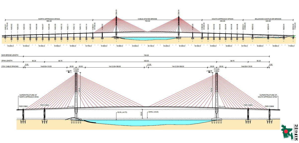 | (২) | প্রকল্পের উদ্দেশ্য/ উপযোগিতা | (১) চাঁদপুর ও লক্ষ্মীপুর জেলা এবং নোয়াখালী ও ভোলা জেলার অংশ বিশেষের সাথে রাজধানী ঢাকার সড়ক যোগাযোগ স্থাপনের মাধ্যমে যাতায়াতের দূরত্ব, সময় ও ব্যয় হ্রাস এবং ঢাকা-চট্টগ্রাম মহাসড়ক (N-1) এর উপর যানবাহনের চাপ কমবে; (২) প্রস্তাবিত সড়কসহ সেতুটি ঢাকা চট্টগ্রাম মহাসড়কের বিকল্প রুট হিসেবে কাজ করবে; (৩) চাঁদপুর জেলার অন্তর্গত মতলব উত্তর ও হাইমচর উপজেলায় অনুমোদিত দুইটি অর্থনৈতিক অঞ্চলের মধ্যে পণ্য পরিবহন সহজতর করার মাধ্যমে দেশের সামগ্রিক অর্থনৈতিক কর্মকাণ্ডে অবদান রাখবে; (৪) নদীর অববাহিকায় নতুন শিল্পাঞ্চলসহ পর্যটন শিল্প বিকাশের পাশাপাশি নতুন কর্মসংস্থানের সৃষ্টি হবে; যা অত্রাঞ্চলের মানুষের জীবনযাত্রার মানোন্নয়নে বিশেষ ভূমিকা রাখবে; (৫) ঢাকার কাছাকাছি হওয়ায় চাঁদপুর জেলার বিভিন্ন উপজেলায় উপশহর গড়ে উঠবে; এতে আবাসনসহ বিভিন্ন অর্থনৈতিক কর্মকান্ডে রাজধানী ঢাকার উপর নির্ভরতা হ্রাস পাবে; (৫) এটি বাংলাদেশে প্রথম ক্যাবল স্টেইড সেতু। নদীর মূল প্রবাহ গতিশীল রাখার লক্ষ্যে নদীতে কোন পিয়ার স্থাপন না করার জন্য সেতুর স্প্যান ৪০০ মিটার রাখা হয়েছে; যা বাংলাদেশে সবোর্চ্চ। এর ফলে নদীতে কোন পলি জমবে না; যা পরিবেশ রক্ষায় গুরুত্বপূর্ণ অবদান রাখবে; (৬) সেতুটি চালু হওয়ার পর এ সেতু দিয়ে প্রথম বছরে দৈনিক ১৯,৮৩৫ টি যানবাহন পারাপার করবে এবং জিডিপি বছরে ০.৭৩৮% (For conservative case 0.382%) বৃদ্ধিতে সহায়তা করবে; (৭) এই সেতু চালু হওয়ার মাধ্যমে চাঁদপুর, লক্ষিপুর, নোয়াখালী ও ভোলা জেলার জনগণ প্রত্যক্ষ ও পরোক্ষভাবে উপকৃত হবে;