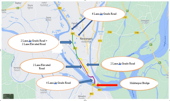 | নির্মাণের কারণ | পঞ্চবটি হতে মুক্তারপুর সেতু পর্যন্ত বিদ্যমান সড়কটি দুই-লেনে উন্নীতকরণ ও দুই-লেন দোতলা রাস্তা নির্মাণের মাধ্যমে মুন্সীগঞ্জ জেলার সাথে ঢাকা ও নারায়ণগঞ্জ জেলাসহ অন্যান্য জেলার সড়ক যোগাযোগ নিরবচ্ছিন্ন, সহজতর ও ব্যয় সাশ্রয়ী করা। মুন্সীগঞ্জ জেলার সাথে ঢাকা ও নারায়ণগঞ্জ জেলাসহ অন্যান্য অংশের সরাসরি সড়ক যোগাযোগে বিদ্যমান সড়কটি ব্যবহৃত হয়। মুক্তারপুর হতে পঞ্চবটি পর্যন্ত সড়কটি খুব সংকীর্ণ (গড় প্রশস্ততা ৫.৫ মিটার), আঁকাবাঁকা ও রাস্তার উভয় পাশে গার্মেন্টস ফ্যাক্টরি, বসত-বাড়ি, দোকানপাট ইত্যাদি থাকায় যানবাহন চলাচলে প্রায়ই দীর্ঘ যানজটের সৃষ্টি হয়। মুন্সিগঞ্জের মুক্তারপুরে ৫ টি সিমেন্ট ফ্যাক্টরি এবং আলু সংরক্ষনের জন্য বেশ কয়েকটি কোল্ড স্টোরেজ থাকায় ২৪ টন হতে প্রায় ৫০ টন পর্যন্ত ওজনের ভারী যানবাহন চলাচল করায় প্রায়শঃই দূর্ঘটনার সম্মুখীন হতে হয় এবং এর ফলে দীর্ঘ যানজটের সৃষ্টি হয়। প্রকল্পাধীন এলাকাটি বিসিক শিল্পাঞ্চল-এর অন্তর্ভূক্ত এবং এ এলাকায় কয়েকটি গার্মেন্টস ফ্যাক্টরী থাকায় প্রতিদিন প্রায় লক্ষাধিক শ্রমিক তিনবেলা রাস্তাটি ব্যবহার করে। ফলে রাস্তায় যানজটের সৃষ্টি হয়। তাছাড়া এ এলাকায় বেশ কয়েকটি রপ্তানিমুখী শিল্পপ্রতিষ্ঠান রয়েছে যার উৎপাদিত পন্য পরিবহনের জন্যও রাস্তাটি ব্যবহার করা হয়। এ সড়কে বিদ্যমান Average Annual Daily Traffic (AADT) ১৭৯১০ টি। ট্রাফিক পূর্বাভাস অনুযায়ী এ যানবাহনের সংখ্যা ২০২৩ সালে দৈনিক ২৩৯২০, ২০২৫ সালে দৈনিক ২৭০০০ টি, ২০৩৩ সালে দৈনিক ৩৯০০০ টি এবং ২০৪৩ সালে দৈনিক ৬৩৫৮০ টি। প্রকল্পটি বাস্তবায়িত হলে ভ্রমণ সময় ৬২.৮৯% হ্রাস, যানবাহনের গতিসীমা ৪.৪৫ গুণ বৃদ্ধি পাবে। |