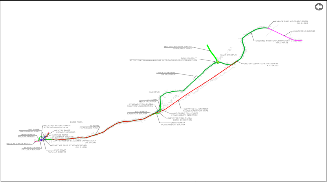 | প্রকল্পের সংক্ষিপ্ত বর্ণনা | প্রকল্পের প্রধান অঙ্গ সমূহ প্রকল্পের আওতায় এ্যাট-গ্রেড সড়ক প্রশস্তকরণঃ ১০.৮১৩ কিলোমিটার ৬২০ মি. এ্যাট-গ্রেড সড়ক ৬-লেনে উন্নীতকরণ (পঞ্চবটি মোড় থেকে ফতুল্লার দিকে ৩১০মি. ও চাষাড়া, নারায়ণগঞ্জ এর দিকে ৩১০ মি.) ৬ কি.মি. এ্যাট-গ্রেড সড়ক ২-লেনে উন্নীতকরণ (পঞ্চবটি হতে ৩য় শীতলক্ষ্যা সেতু পর্যন্ত) ৩.৭৫ কি.মি. এ্যাটগ্রেড সড়ক ৪-লেনে উন্নীতকরণ (৩য় শীতলক্ষ্যা সেতু হতে মুক্তারপুর সেতু পর্যন্ত) মুক্তারপুর সেতুর দক্ষিণ প্রান্তে ৪৪৩ মি. এ্যাট-গ্রেড সড়ক ৪-লেনে উন্নীতকরণ দোতলা রাস্তা/এলিভেটেড রোডঃ ৯.০৬ কিলোমিটার এলিভেটেড রোডঃ ৬.২৬০ কিলোমিটার (পঞ্চবটি হতে কাশিপুর পর্যন্ত ৩.৫ কি.মি. এ্যাট-গ্রেড সড়কের উপর ও কাশিপুর হতে চর সৈয়দপুর পর্যন্ত ২.৭৬ কি.মি. নিচু ভূমির উপর দিয়ে) র্যাম্পঃ ২.৮০৫ কিলোমিটার (সংখ্যা ৬টি) ড্রেন নির্মাণঃ ১৭.৬১ কি.মি. টোল প্লাজা : ০৪ টি , ওজন স্কেল: ০৫ টি কাশিপুর ও গোগনগর সেতু প্রশস্তকরণ ১টি Small RCC Bridge at Shasongaon ১টি ট্রাক স্টান্ড ও 2টি Non-Motorized Vehicle (NMV) Parking |